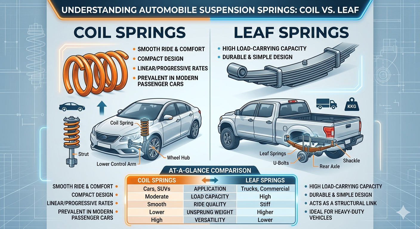 Le deux types fondamentaux de ressouts de suspension automobile sont ressorts hélicoïdaux et ressorts à lames . Ces deux composants représentent la technologie fondamentale utilisée pour supporter le poids du véhicule et absorber les chocs de la route dans la grete majorité des conceptions automobiles modernes et classiques. Bien qu'il existe d'autres systèmes tels que les ressorts pneumatiques ou les barres de torsion, les variantes à bobines et à lames restent les normes de l'industrie en raison de leur fiabilité, de leur rentabilité et de leurs performances éprouvées au fil des décennies d'évolution technique.